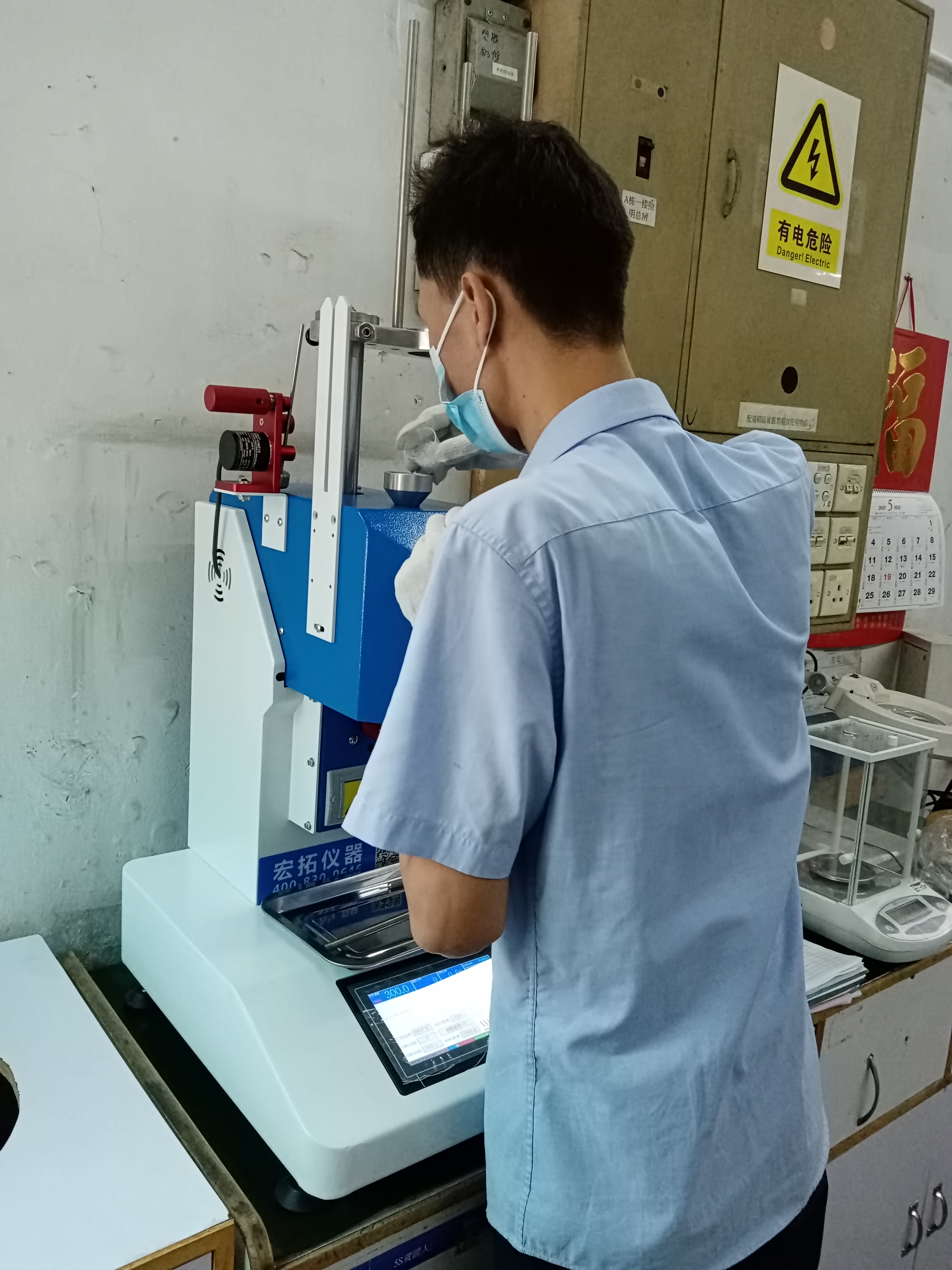東莞新聯(lián)電器制品有限公司實(shí)驗(yàn)室現(xiàn)場工作人員在學(xué)習(xí)如何使用HT-3682VM-EL電動款熔融指數(shù)儀