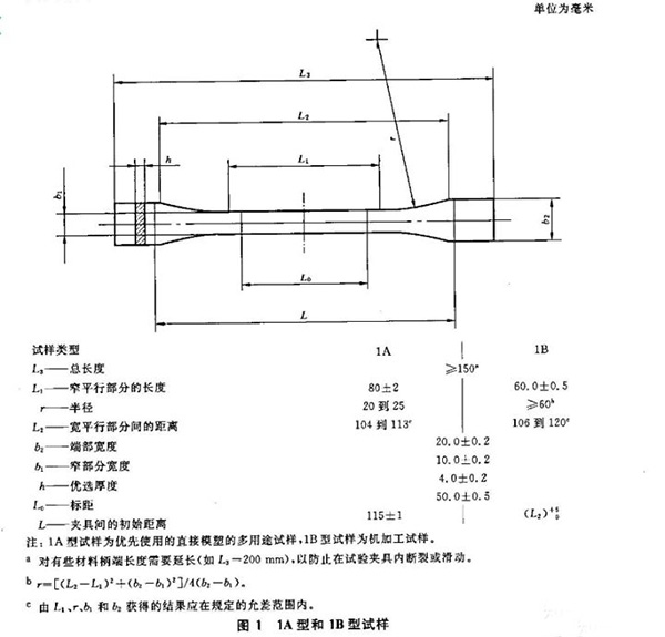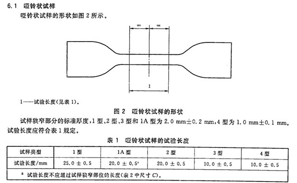 試樣應(yīng)為圖所示1A型和1B型的啞鈴試樣,直接模塑的多用途試樣選1A型,機(jī)加工試樣選用1B型。